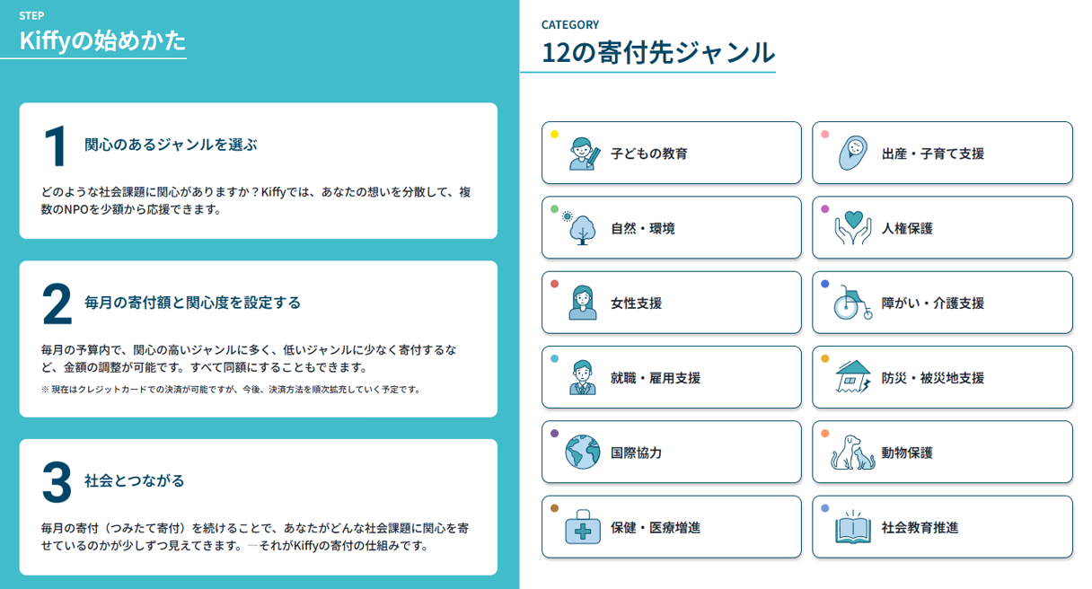 「Kiffy」では、関心のある12の寄付先ジャンルを選択し、毎月の寄付金額と関心度(配分割合)を設定するだけで、「つみたて寄付」を行なうことができます。https://share.kiffy.jp/