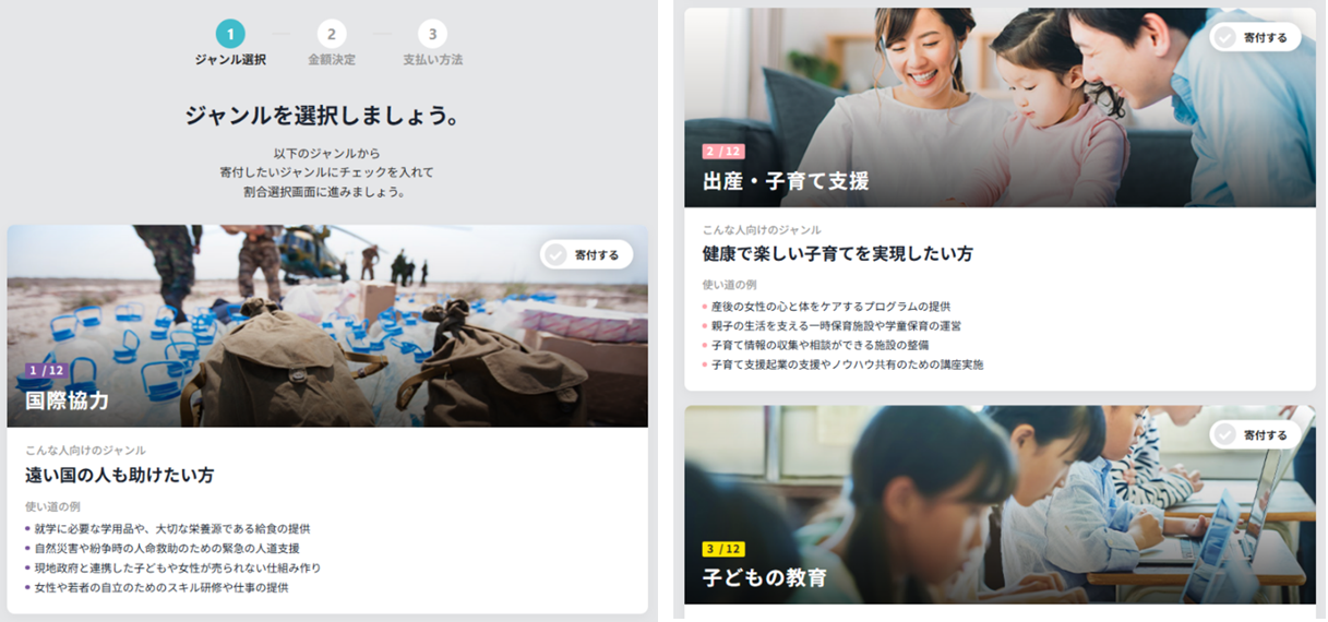 選択したジャンルと配分は、ご自身の支援のかたちを示す「ソーシャル・ポートフォリオ」として可視化され、寄付の見える化と継続を後押しします。